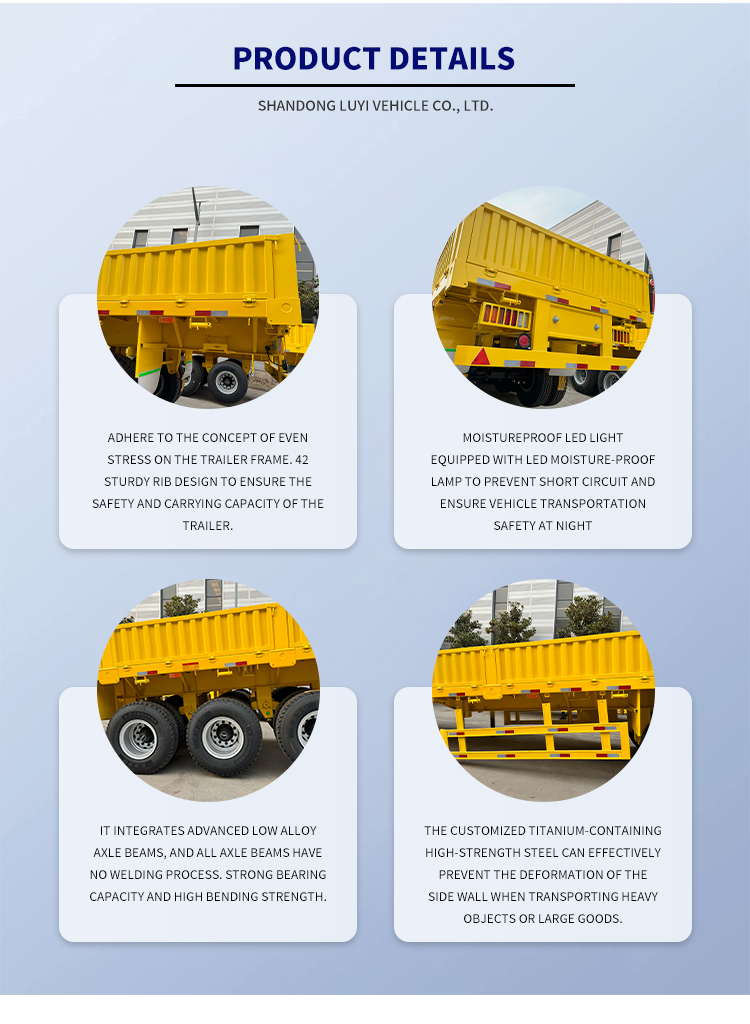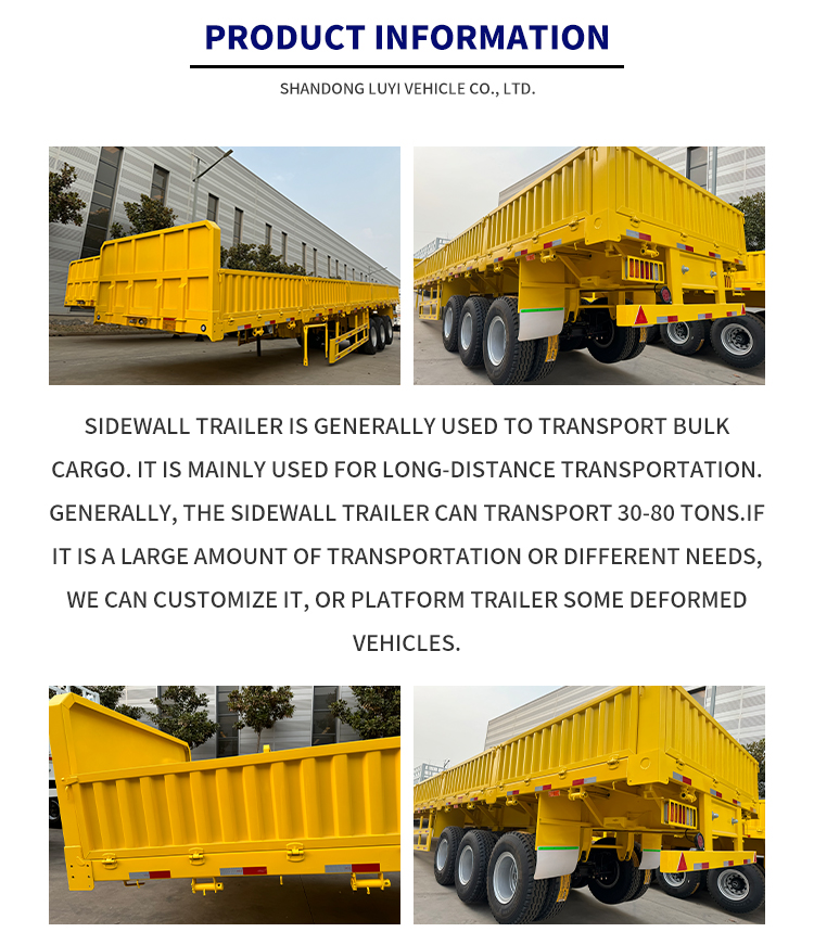 Rơ moóc bán rơ moóc bằng thép-nhôm 3 trục LUYI 13m, có xuất xứ từ tỉnh Sơn Đông, Trung Quốc, là loại sơ mi rơ moóc có tường bên hoàn toàn mới được thiết kế đặc biệt để vận chuyển hàng hóa bằng xe tải. Được làm bằng thép chất lượng cao, rơ moóc cân bằng được độ bền kết cấu và độ bền, với tải trọng hiệu dụng tối đa 20.001-25.000 kg, dễ dàng đáp ứng nhu cầu vận chuyển hàng hóa hạng trung và hạng nặng.