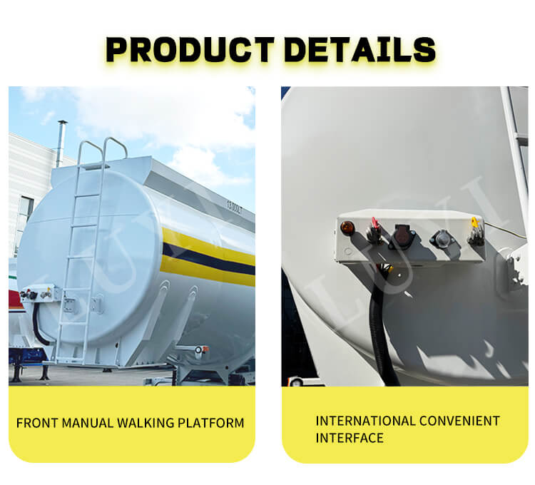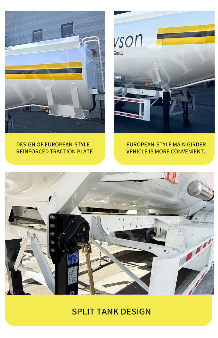 Sơ mi rơ moóc thùng nhiên liệu diesel 3 trục 3 thùng 42.000L LUYI, một thiết bị vận chuyển dầu chuyên nghiệp hoàn toàn mới, được sản xuất tại Sơn Đông, Trung Quốc. Thân của nó được làm bằng thép, có kích thước 1065025003800mm. Thiết kế 3 thùng cho phép tải động cơ diesel được phân loại và dung tích lớn 42.000L, kết hợp với tải trọng tối đa 5.001-10.000kg, đáp ứng nhu cầu vận chuyển dầu từ nhỏ đến trung bình.