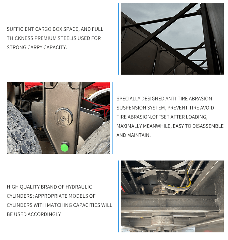 Với kích thước 11000x2500x3500mm và tải trọng tối đa 25001-30000kg, nó đáp ứng nhu cầu tải nặng một cách hiệu quả. Nó được trang bị hệ thống treo cơ khí, lò xo lá 90(W)mm×13(Dày)mm×10(Layer) và hệ thống phanh kép giúp vận hành ổn định và an toàn. Thiết bị hạ cánh 28Ton tiêu chuẩn và chốt vua JOST 2"(50mm)/3,5"(90mm) nâng cao khả năng thích ứng. Màu sắc và logo có thể được tùy chỉnh, khiến nó trở thành sự lựa chọn linh hoạt và đáng tin cậy cho nhu cầu vận chuyển hạng nặng.