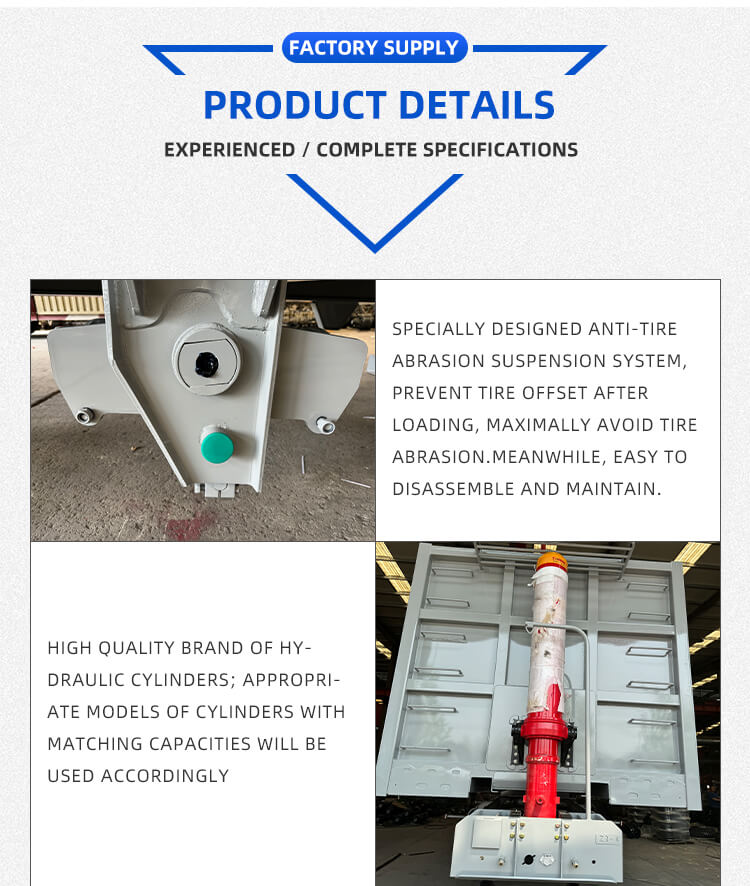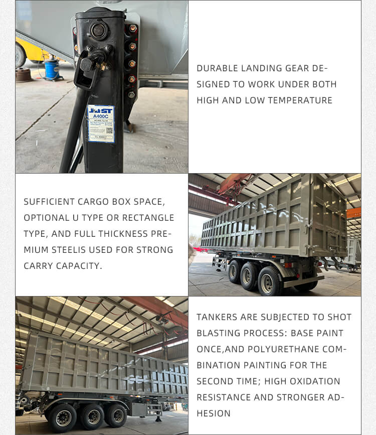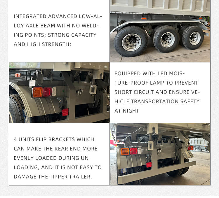 Nó cung cấp các cấu hình linh hoạt để phù hợp với các nhu cầu đa dạng: các tùy chọn trục bao gồm trục 2/3/4 từ các thương hiệu đáng tin cậy BPW và FUWA, cũng như các lựa chọn hệ thống treo gồm hệ thống treo cơ học hoặc khí nén để lái xe ổn định. Được trang bị lốp 12R22.5, thiết bị hạ cánh 28Ton tiêu chuẩn và chốt vua JOST 2"(50mm)/3,5"(90mm), nó đảm bảo khả năng thích ứng mạnh mẽ. Quy trình sơn polyurethane nâng cao độ bền, màu sắc có thể tùy chỉnh và được bảo hành sáu năm, khiến nó trở nên đáng tin cậy khi vận chuyển cát và sỏi dài hạn.