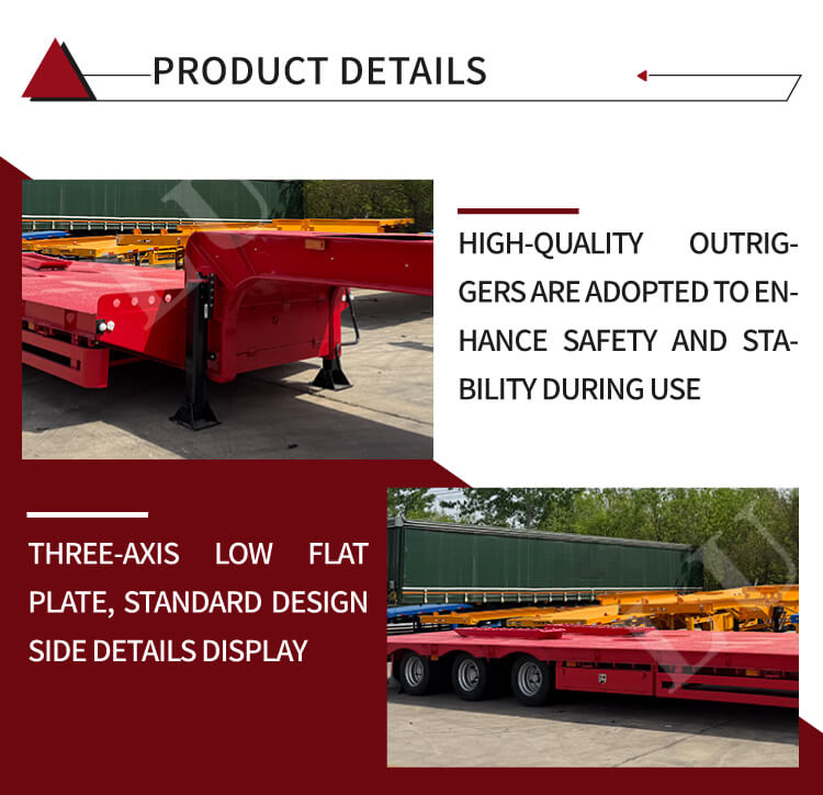 Được chế tạo bằng thép chất lượng cao, rơ moóc có kích thước 17000×2500mm và tải trọng tối đa 80T, dễ dàng xử lý việc chuyển các thiết bị hạng nặng. Nó cung cấp các cấu hình trục linh hoạt (trục 2/3/4) để thích ứng với các nhu cầu tải trọng khác nhau, kết hợp với lốp 12R22.5. Cả hệ thống treo cơ khí và hệ thống treo khí đều là tùy chọn, đảm bảo lái xe ổn định và bảo vệ hàng hóa hiệu quả trong quá trình vận chuyển.