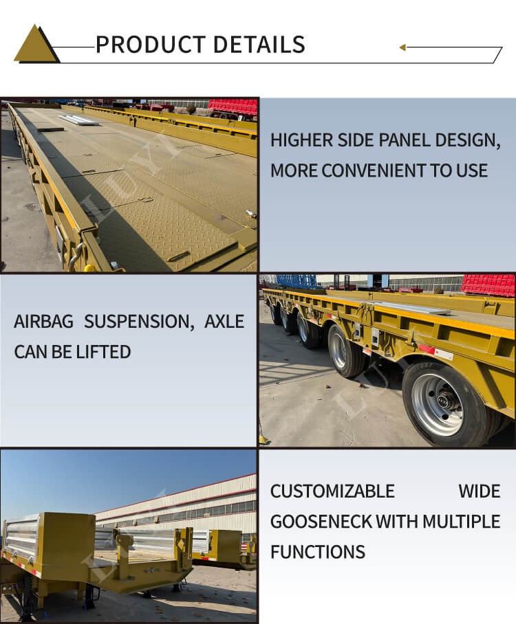 Sơ mi rơ moóc giường thấp treo khí nén 5 trục 16m 80 tấn LUYI, một loại sơ mi rơ moóc cao cấp đến từ Sơn Đông, Trung Quốc, được thiết kế để vận chuyển thiết bị hạng nặng. Được chế tạo từ thép cường độ cao, kích thước tiêu chuẩn 16000×3500×1800mm, tải trọng 60-200 tấn, dễ dàng xếp dỡ hàng hóa nặng như máy móc lớn.