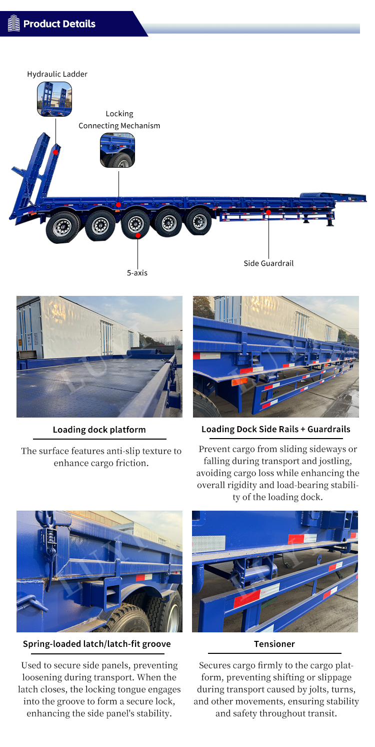 Có nguồn gốc từ Sơn Đông, Trung Quốc, sơ mi rơ moóc sàn thấp hạng nặng 80 tấn Luyi 5 trục là loại xe tải rơ moóc mạnh mẽ được thiết kế để vận chuyển tải trọng nặng. Được chế tạo bằng thép chất lượng cao, nó có kích thước 130003000178 mm và khả năng chịu tải tối đa 80.000 kg, lý tưởng để vận chuyển các thiết bị nặng khác nhau một cách dễ dàng.