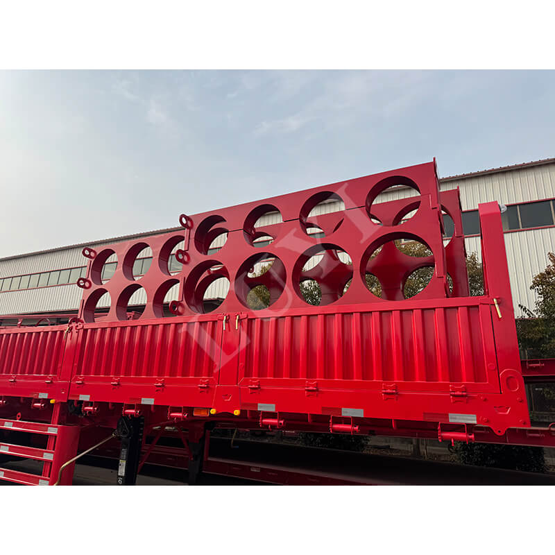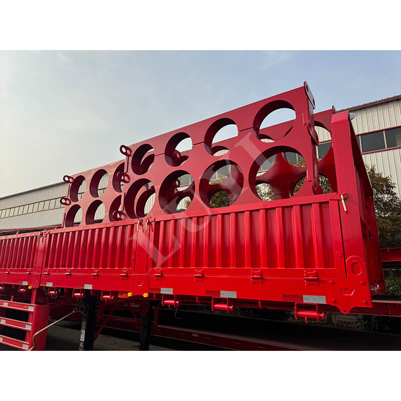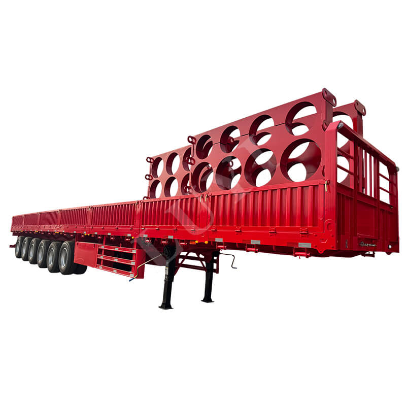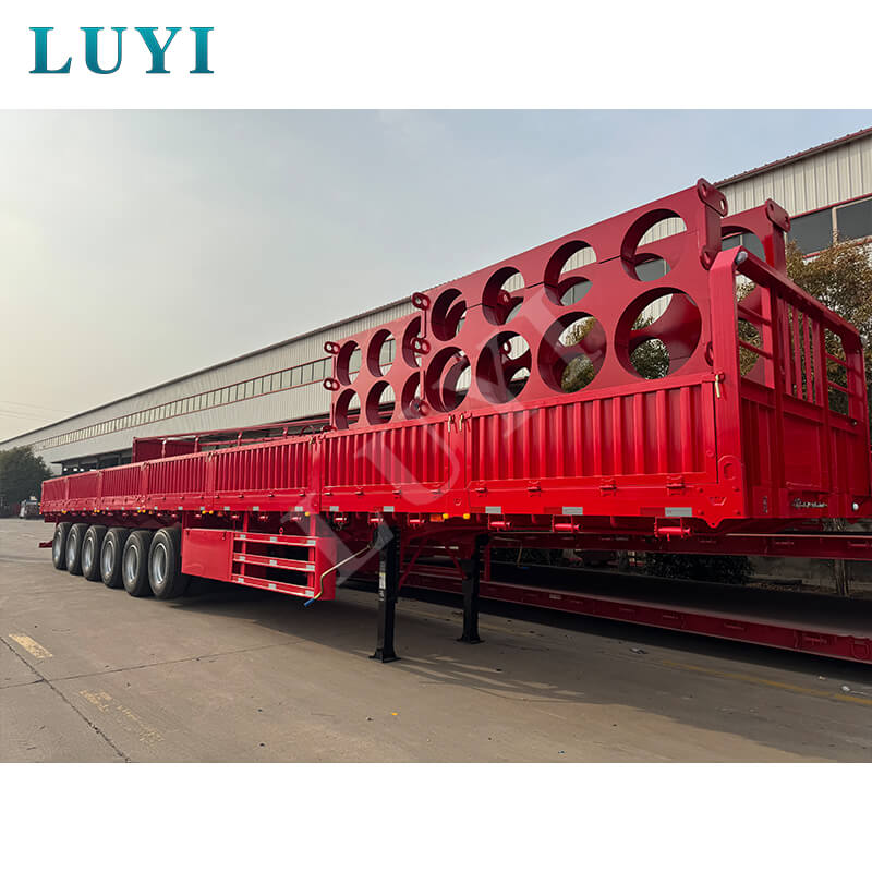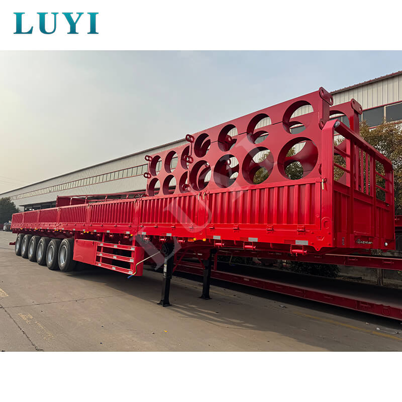 Sơ mi rơ moóc tường bên LUYI 6 trục 15,5m 80-100 tấn 40ft, còn được gọi là sơ mi rơ moóc dạng cọc/phẳng, có nguồn gốc từ Sơn Đông, Trung Quốc. Nó là loại sơ mi rơ moóc chất lượng cao được thiết kế để vận chuyển container và hàng rời. Được làm hoàn toàn bằng thép, nó có kích thước 15500x2500x1600mm và có tải trọng hiệu dụng tối đa 60-100 tấn, có khả năng chịu tải mạnh mẽ để dễ dàng đáp ứng nhu cầu vận chuyển hàng hóa nặng.