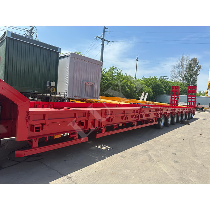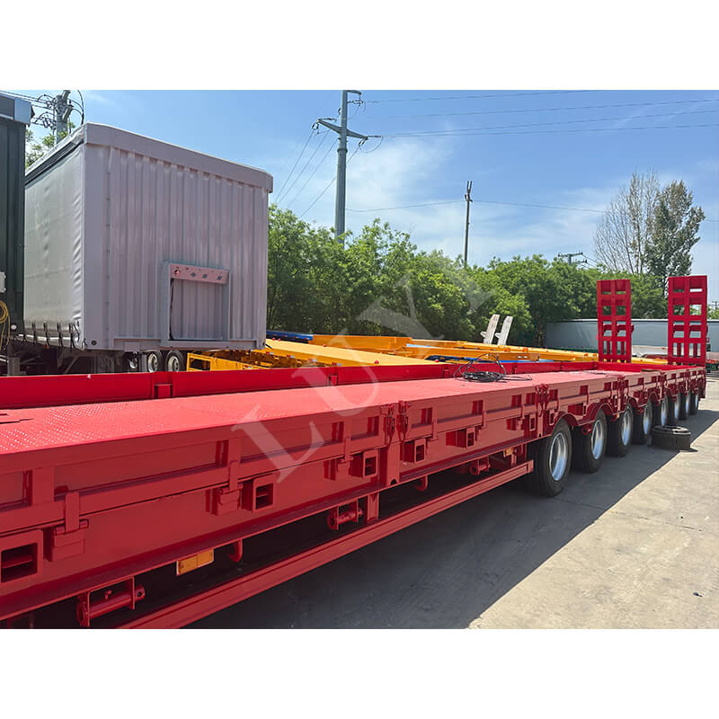 Được chế tạo bằng thép carbon hoặc nhôm chất lượng cao, nó cân bằng các yêu cầu về độ bền và trọng lượng nhẹ, có tải trọng tối đa 100 tấn để dễ dàng xử lý các tình huống vận chuyển thiết bị nặng khác nhau. Được trang bị thiết kế 8 trục, nó cung cấp các trục thương hiệu Fuwa hoặc BPW tùy chọn, kết hợp với hệ thống treo cơ khí hoặc hệ thống treo khí nén, đảm bảo sự ổn định khi lái và an toàn hàng hóa. Có ba thông số kỹ thuật của lốp: 12R22.5, 12.00R20 và 11R22.5, phù hợp với các điều kiện đường khác nhau.