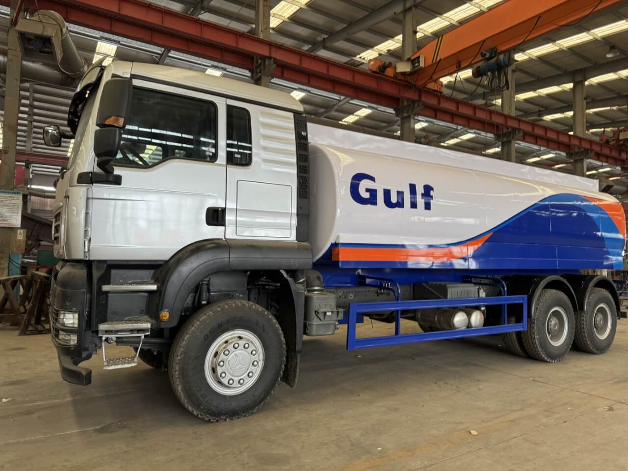 Khách hàng Kyrgyzstan lần đầu tiên bước vàoxe bồn chở dầuxưởng sản xuất của Nhà máy Luyi. Bên trong xưởng, dây chuyền tạo hình bồn của xe bồn chở xăng dầu đang được vận hành hàn tự động. Các kỹ thuật viên của Nhà máy Luyi đã giới thiệu với khách hàng Kyrgyzstan rằng xe bồn chở dầu sử dụng thép đặc biệt dành cho bình áp lực Q345R, có độ dày bồn là 8 mm. Sau khi kiểm tra áp lực nước ở mức 1,2 lần áp suất làm việc, không có hiện tượng rò rỉ, hoàn toàn tuân thủ các tiêu chuẩn an toàn dành cho phương tiện vận chuyển hàng nguy hiểm ở Kyrgyzstan. Khách hàng Kyrgyzstan cúi xuống kiểm tra chất lượng mối hànxe tải chở dầu, đo độ dày bể bằng thước cặp và thể hiện sự ghi nhận về độ chính xác trong sản xuất của Nhà máy Luyi.