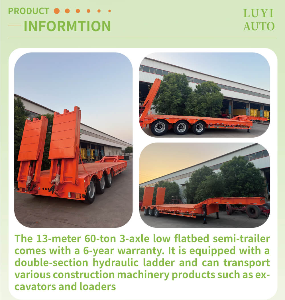 Sơ mi rơ moóc cổ ngỗng 3 trục 60 tấn có thể tháo rời LUYI, được sản xuất tại Sơn Đông, Trung Quốc, là loại xe moóc chở hàng chuyên nghiệp. Thân của nó được làm bằng thép cường độ cao, có kích thước 1700030001500mm. Cấu trúc chắc chắn và đủ không gian, cho phép tải hàng nặng ổn định và thích ứng với các hoạt động kéo xe tải khác nhau.